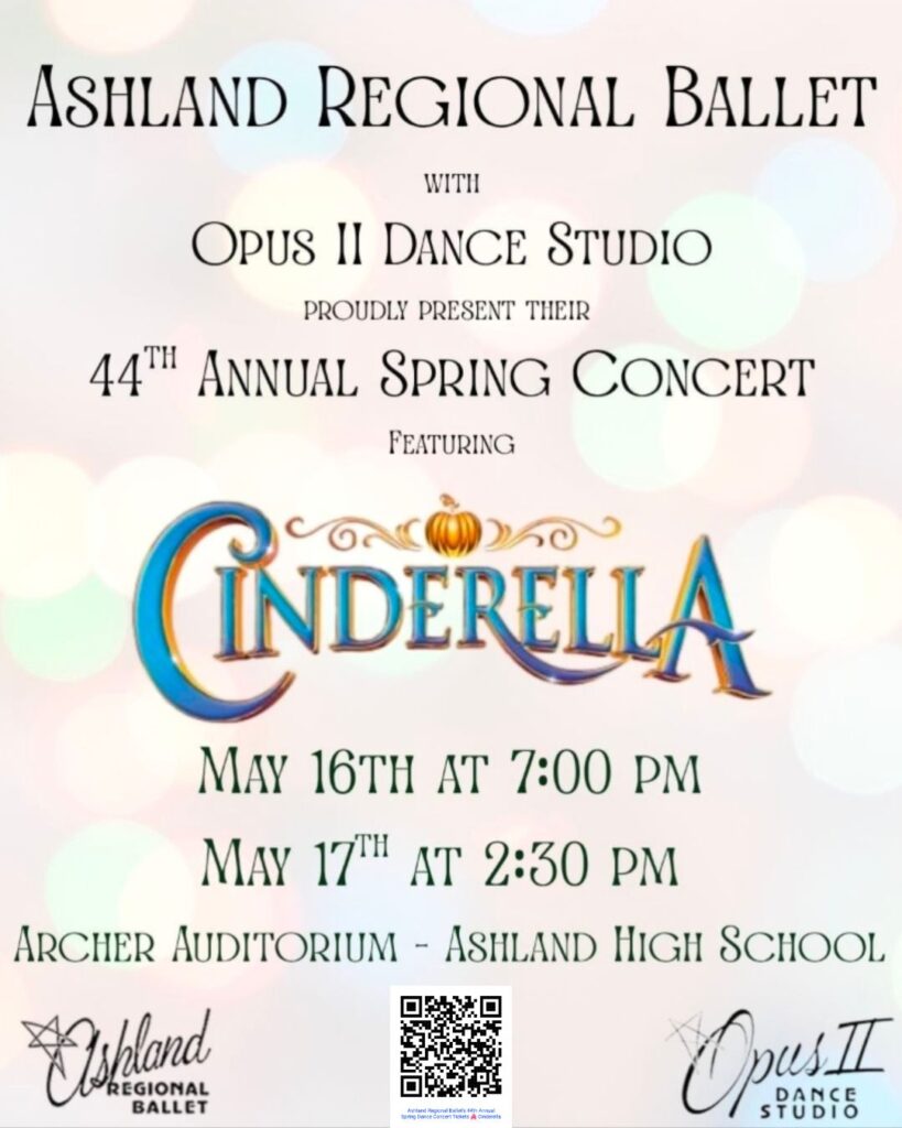 May 16th at 7pm and 17th 2:30pm at Archer Auditorium! The show will also feature our Opus II Dance Studio students doing a variety of ballet, tap, jazz, and modern dances! Tickets are on sale at ashlandregionalballet.com/ticket-information