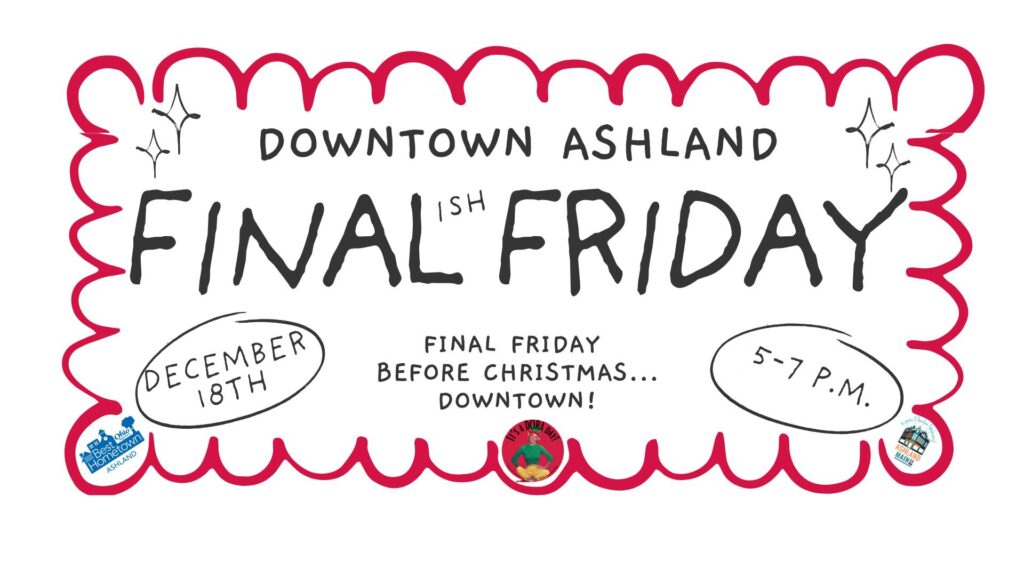 You guys, Christmas is ON Friday this year, so if you want to get that shopping done without the rush and stress, get down here already! Our downtown shops will be open later, so if you can’t get to us during the week, or on the weekend, come down after work and enjoy all the great stores we have in downtown Ashland, then stick around for a meal in one of our amazing restaurants! Final Fridays are also DORAs, so feel free to visit for an adult beverage, then take it with you to sip and shop!
